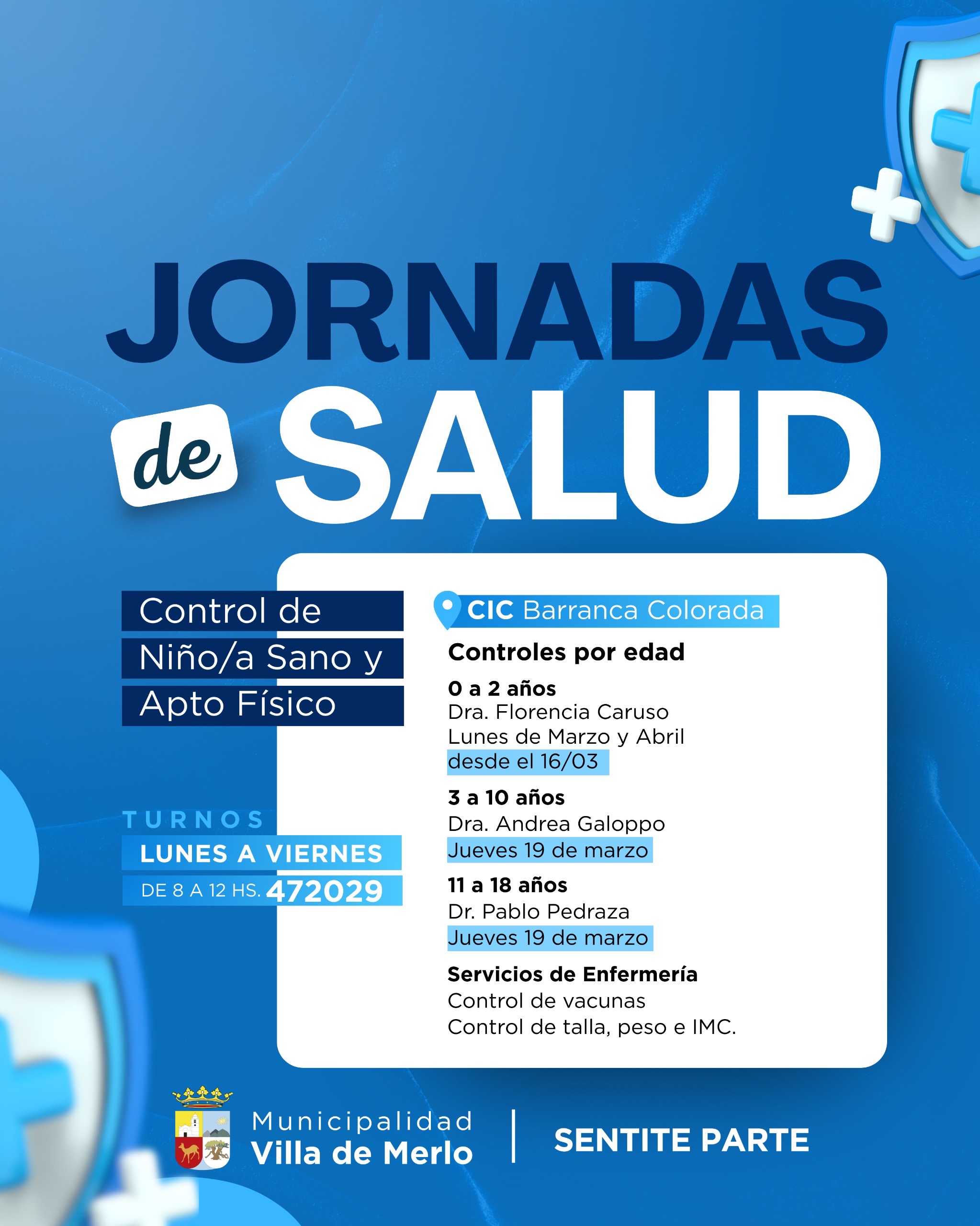 El Municipio de la Villa de Merlo llevará adelante durante los meses de marzo y abril una serie de Campañas Gratuitas de Salud en distintos Centros de Atención Primaria de la Salud (CAPS), con el objetivo de garantizar el acceso al apto físico escolar y al control integral de niño/a sano.