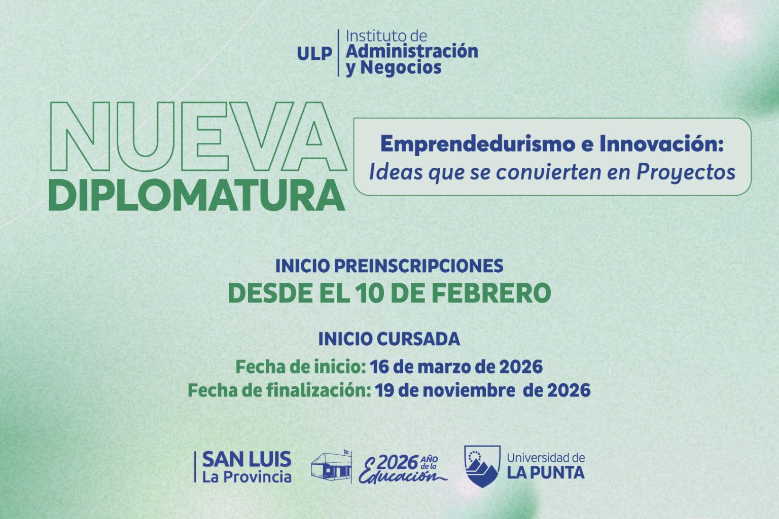 La Universidad de La Punta (ULP), a través de su Instituto de Administración, presentó este viernes en Casa de Gobierno una nueva Diplomatura en Emprendedurismo e Innovación Tecnológica, una propuesta formativa gratuita orientada a quienes deseen poner en marcha un proyecto propio o fortalecer iniciativas en curso.